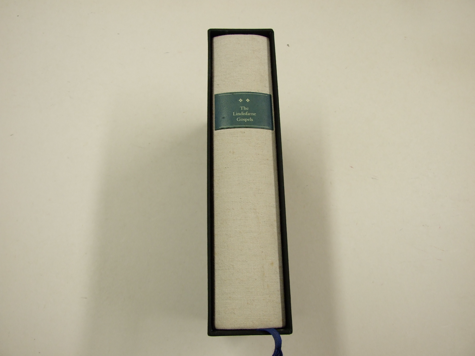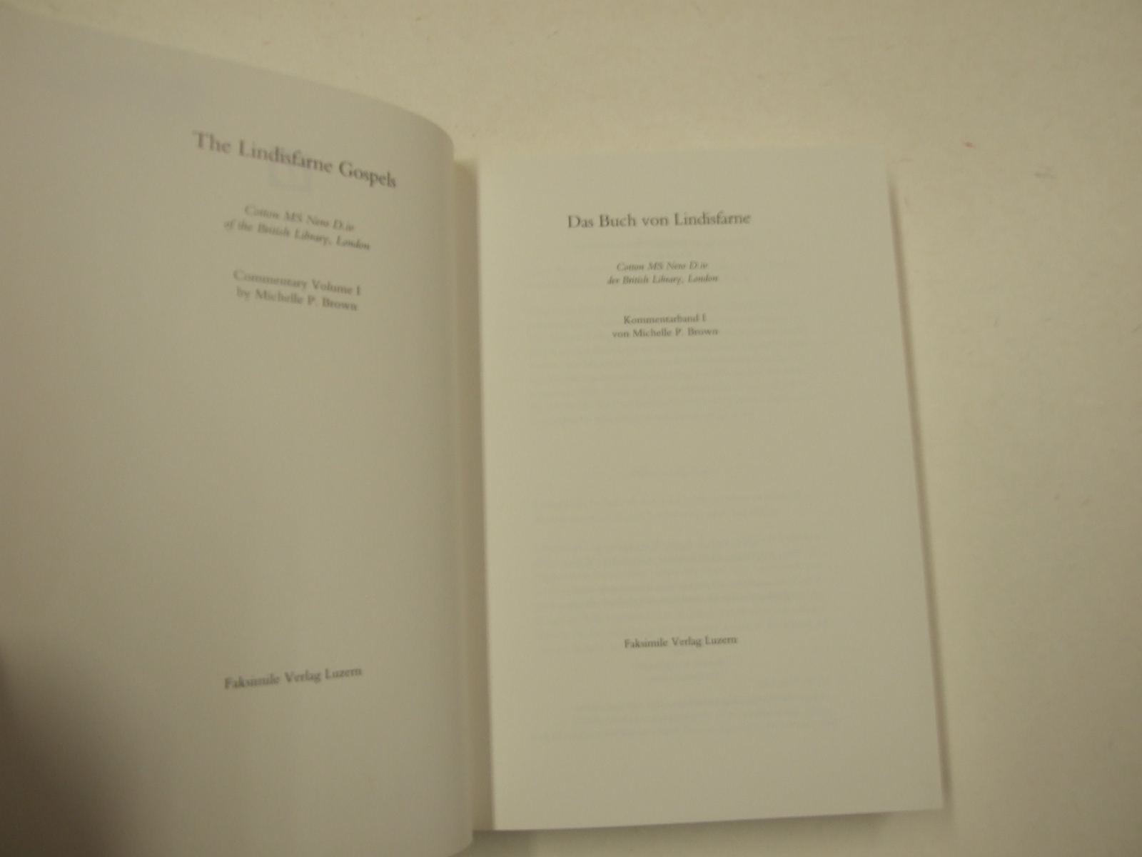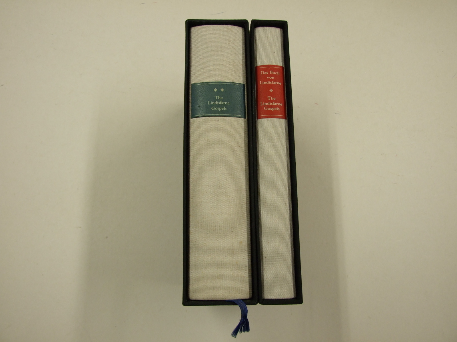 Published in Switzerland by Verlag. 2003. First Edition First Impression. Near Fine Hardbacks. Commentary volumes only. Previous owner name and comment "Accompanies copy 721" in neat pen on preliminary pages. Very Good slipcases. Some marks to panels of slipcases. Commentary volumes I and II on The Book of Lindisfarne / The Lindisfarne Gospels. Cotton MS Nero D.iv from the British Library, London. hardcover, linen. 2 volumes (25x17.5 cm). Volume I bilingual German and English, white mottled linen bindings, mounted. red or blue leather spine label with white title embossing, black linen slipcases.