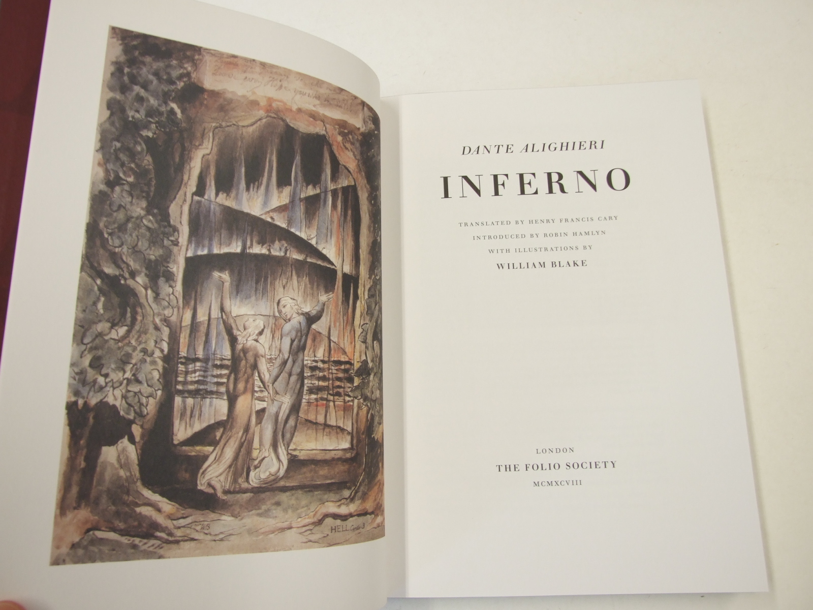 Published in United Kingdom by Folio Society. 2007. Reprint. Fine Quarter-Leather Hardback. No inscriptions or bookplates. Fine slipcase. Reprint with Blake picture to front panel. Folio - over 12" - 15" tall. Stunning edition of Dante's Inferno with 32 illustrations by William Blake. One of those wonderful productions only the Folio Society, bring out in 'full cloth printed with Blake's engraving of his watercolour to Canto 25, - The Serpent attacking Buoso Donati (Tate Gallery, London) Lettered endpapers - All Hope abandon ye who enter here. Typeset at the Folio Society in Monotype Walbaum. Printed by Bath Press Colourbooks on Book Design Smooth Paper and bound at the Bath Press. Ink/watercolour reproduction of illustrations by William Blake now in museums across the world. One of the finest Folio productions. Illustrated by William Blake.