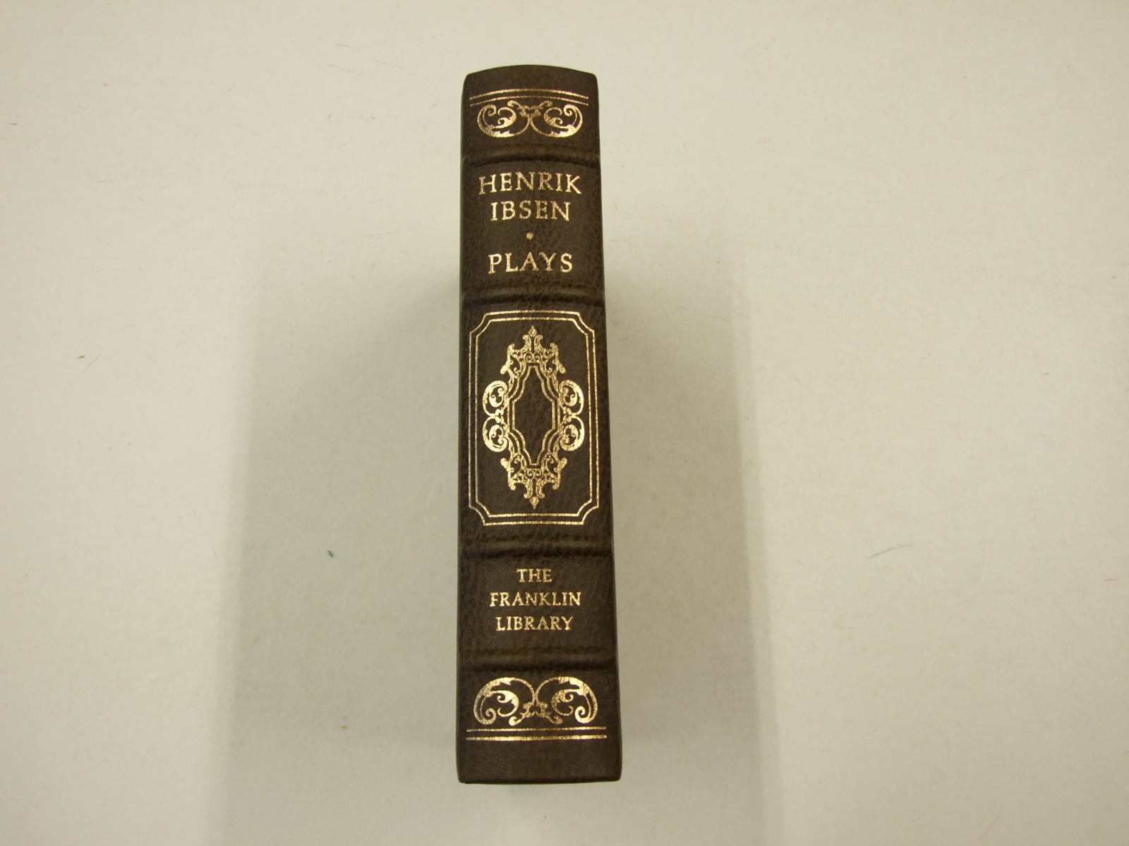 Published in United States by Franklin Library. 1977. Reprint. Fine Leather Hardback. Henrik Ibsen, translated by Eva LeGallienne - Includes A Doll's House, Ghosts, An Enemy of the People, The Wild Duck, Hedda Gabler, The Master Builder. No inscriptions. Collector's edition. One of the 100 Greatest Books of all time. Elaborate gold embossed decorations, raised spine bands, silk moire endpapers, all page edges gilt, and permanently bound-in ribbon page marker. Printed on fine archival acid-neutral paper. A magnificent volume. Easton Press publishes sumptuously produced books in full-leather bindings with gilt edges. Rarely available in the UK.