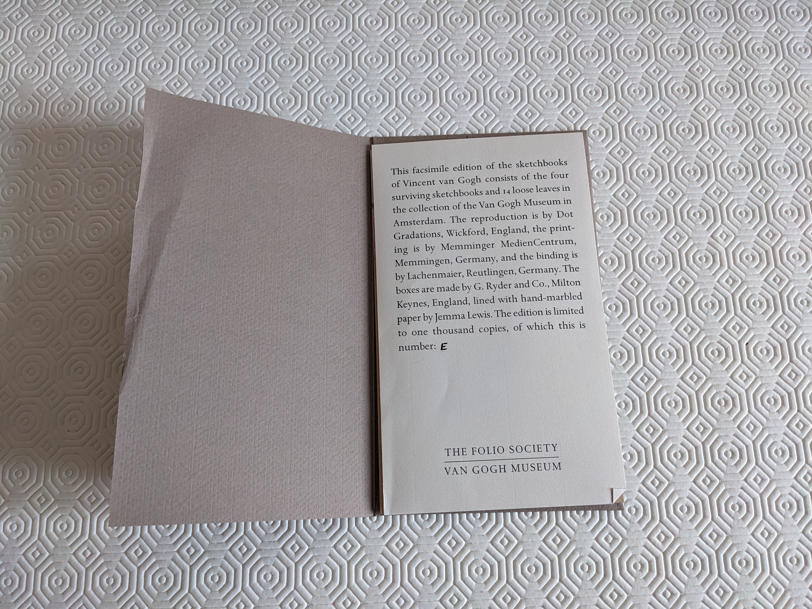 Published in London by Folio Society. 2013. First Thus. 4 Fine Hardbacks. No inscriptions or bookplates. Fine solander box. The box also contains a collection of facsimiles of loose sketchbook pages; the small folder containing these is creased on one edge with a small tear. The folder also contains the limitation details; this is copy letter 'E' of 1000 numbered copies and a small number of lettered copies produced. There is also a booklet with explanatory texts from Marije Vellekoop. The sketchbooks are a relatively little-known part of his otherwise world-famous oeuvre. They contain scribblings, hastily-scrawled notes, prescriptions and even transcriptions of complete poems. The sketchbooks also contain drawings and detailed preliminary sketches for paintings to come. They ultimately contain miniature works of art. A joint publication of the Van Gogh Museum and The Folio Society, the facsimile edition was published in a limited run of 1,000 copies of which this is number 612 (marked on a card in the loose collection of sketches). The sketchbooks are presented in a luxury box which also contains a collection of facsimiles of loose sketchbook pages and a booklet with explanatory texts from Marije Vellekoop, Head of Art, and Renske Suijver, Researcher at the Van Gogh Museum.