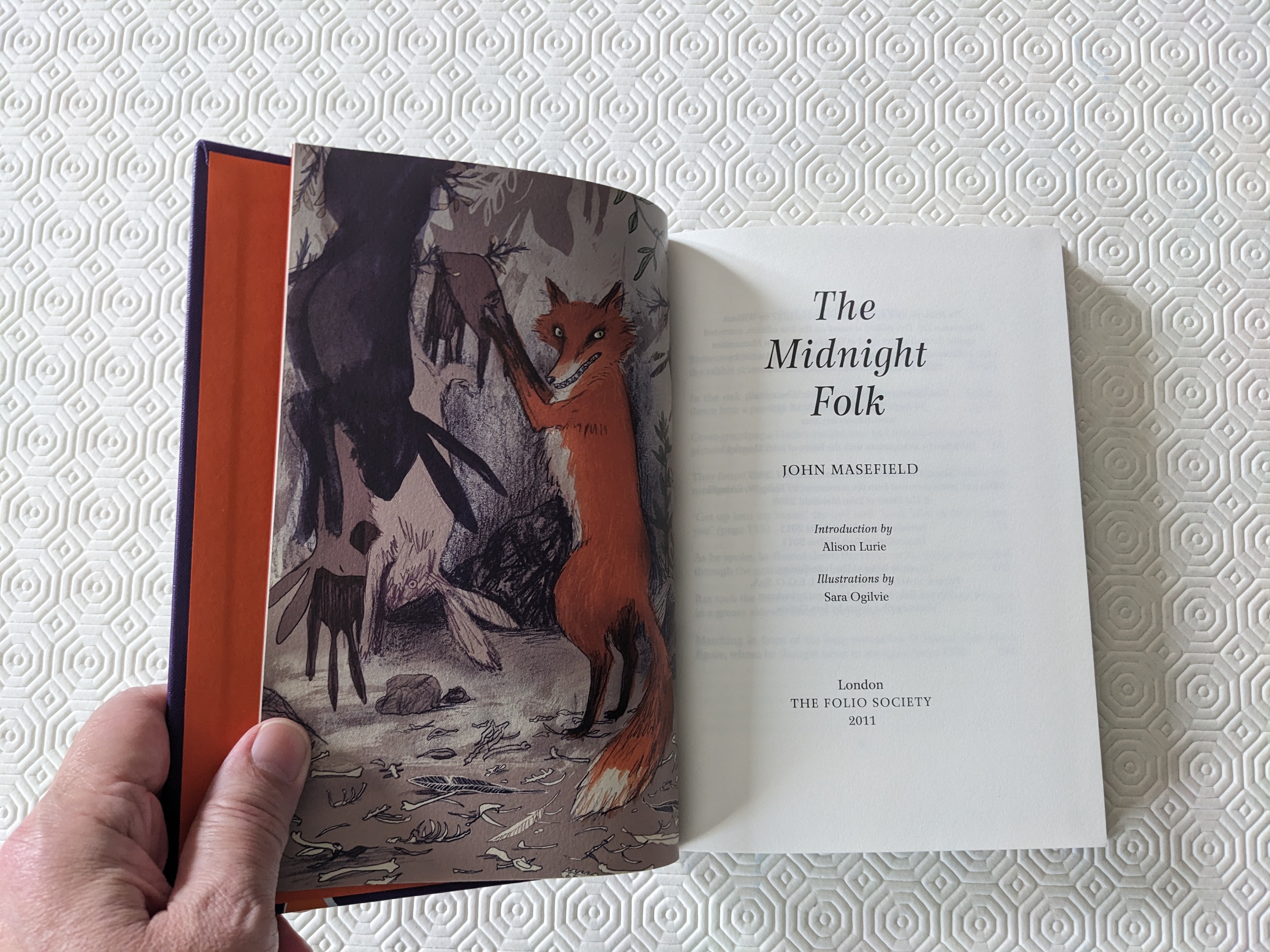 Published in London by Folio Society. 2011. First Thus. Fine Hardback. No inscriptions or bookplates. Fine slipcase. Introduced by Alison Lurie. Book Illustrated by Sara Ogilvie. Bound in buckram. Blocked with a design by the artist. Frontispiece and 7 colour illustrations. 216 pages. Book Size: 9 x 6 .25. Young Kay Harker lives in an old house in the country, filled with portraits of his ancestors. His only companions are his unpleasant guardian Sir Theopompus and his governess Sylvia Daisy Pouncer (who, Kay suspects, has stolen all his toys). Life is lonely and dull, until one night Kay's great-grandpapa Harker, a sea captain, steps out of his portrait to tell him about a stolen treasure that belongs to Kay's family. The evil Abner Brown is searching for it too, but Kay is helped by the midnight folk: creatures like Nibbins the cat and Rollicum Bitem Lightfoot the fox, and even his lost toys, who will join him on his dangerous quest. The Midnight Folk is a feast of imaginative story-telling, a glorious cornucopia of pirates and witches, lost treasure and talking animals. Although it was published in 1927, it evokes an older world: houses are lit by oil lamps, and travel is by horse, carriage – or broomstick. Masefield perfectly captures a child's perspective, from the terrors of tigers under the bed to the horrors of declining a Latin adjective. Yet there is also plenty of humour that adults will appreciate, from Miss Piney Trigger, who swigs champagne in bed and prides herself on having backed a host of Derby winners, to Kay's lessons: 'Divinity was easy, as it was about Noah's Ark. French was fairly easy, as it was about the cats of the daughter of the gardener.' This mingling of past and present, reality and fantasy, has made this one of the most rewarding and influential children's books ever written.