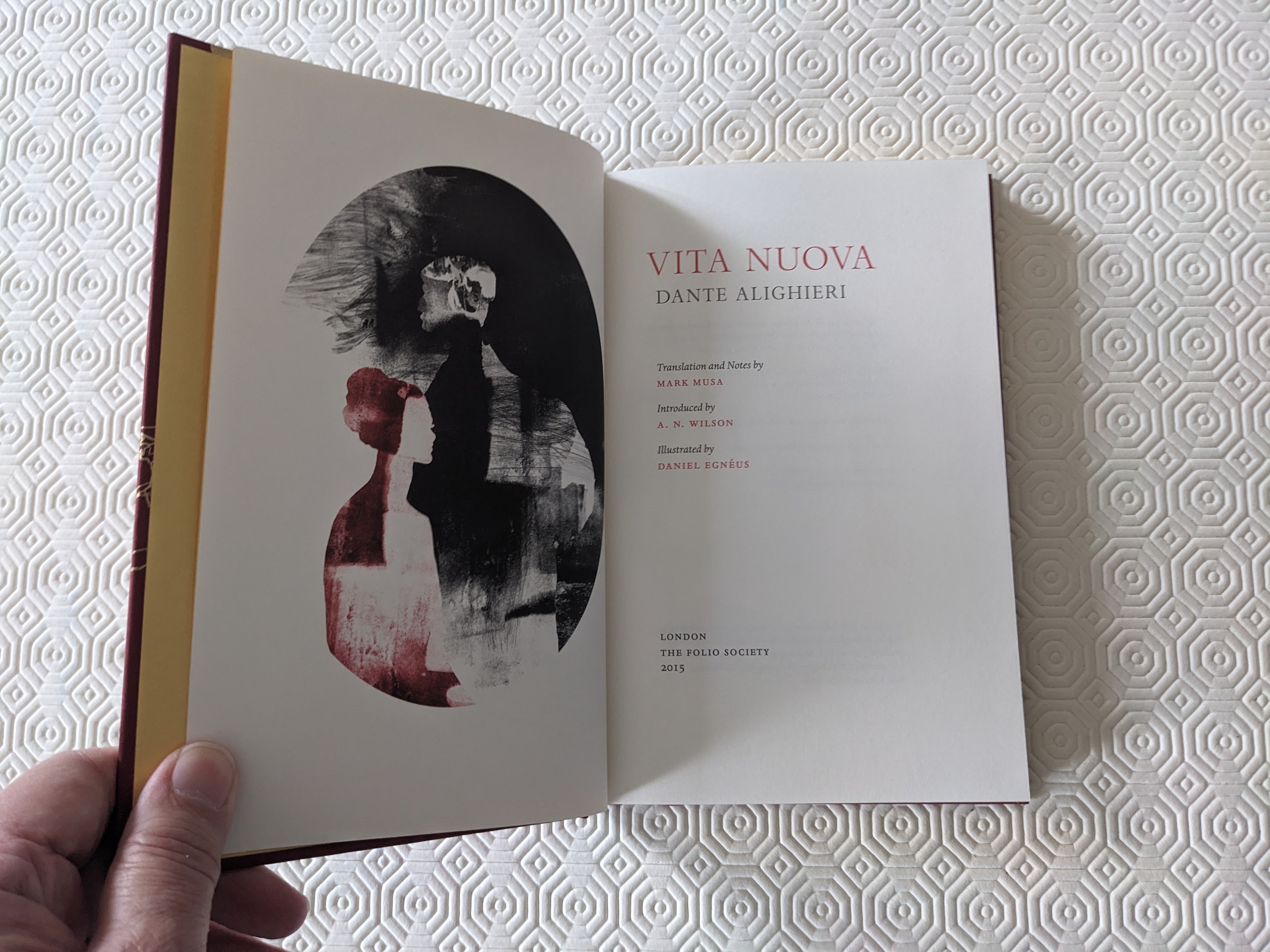Published in London by Folio Society. 2015. First Thus. Fine Hardback. No inscriptions or bookplates. No slipcase. Translated by Mark Musa. Introduced by A. N. Wilson. Illustrated by Daniel Egnéus. Exquisite illustrations accompany this captivating meditation on love, beauty and spiritual awakening. Vita nuova. Dante Alighieri called the Vita nuova ('new life') his libello, or 'little book'; multi-faceted, intriguing and absorbing, it is diminutive only in length. Written between 1292 and 1294, it is the first of Dante's major writings and the essential precursor to his Divine Comedy. Elaborately and symbolically patterned, the book purports to contain experiences copied from the poet's 'book of memory'. It details the 'new life' which dawned when, at the age of nine, he first met Beatrice, one of literature's most alluring heroines and Dante's guiding force (though little is known of her life): 'From that time on', declares Dante, 'Love governed my soul.'. . Beatrice, who is associated throughout with the number nine, first appears 'dressed in the most noble of colours, a subdued and decorous crimson': this Folio edition is bound to match, and crimson forms the palette for the exquisite illustrations by Daniel Egnéus. Printed in two colours, the book presents the Italian text alongside a facing-page translation by Dante scholar Mark Musa, which, as A. N. Wilson writes, captures 'almost miraculously both the crystalline qualities of Dante's early verses and the robustness of his Italian prose'. Dante describes Beatrice as 'one who is through all ages blessed'; 750 years after the author's birth, the Vita nuova still sings today. Vita nuova book. Bound in cloth, blocked with a design by Daniel Egnéus. Set in Dante with Bembo Titling as display. 208 pages. 7 integrated mono- and duotone illustrations, 3 ornaments. Gilded page edges. Ribbon marker. 9" x 5.25". A moving meditation on ethereal and earthly love. From the Folio Society description.